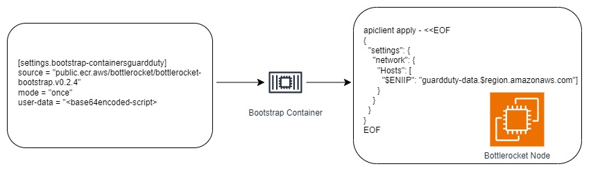 This script uses apiclient to inject the GuardDuty PrivateLink mapping into /etc/hosts via the Bottlerocket API.